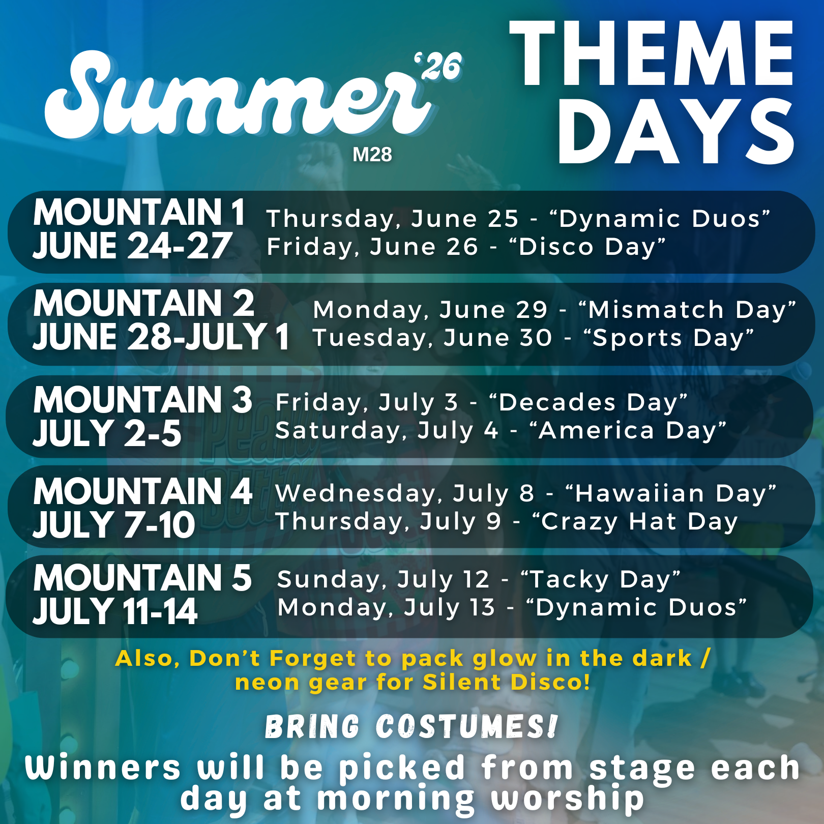 Every Morning at Worship we have a theme day Competition where the best dressed wins a prize! Encourage your students to pack dress up themes! More Info about each day is found below: